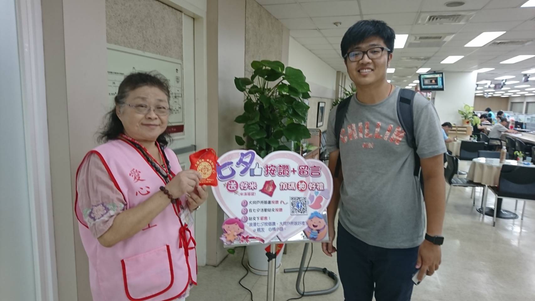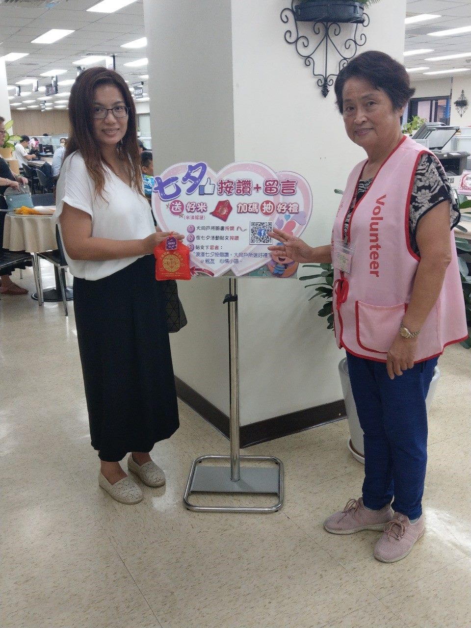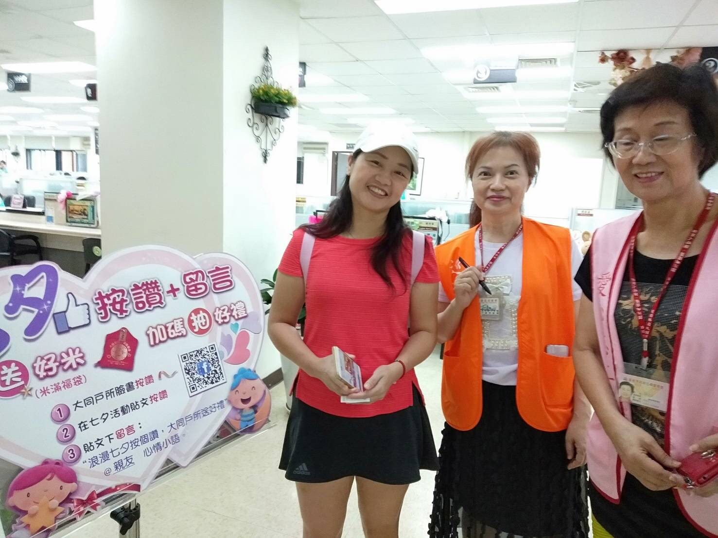 本所在七夕情人節當週(108年8月5日至108年8月9日)特別推出「浪漫七夕按個讚,大同戶所送好禮」活動,活動期間按讚加入本所粉絲專頁、於活動貼文按讚並tag一位好友留下想對對方說的話,即贈送諧音美滿的「米滿福袋」1個,另外再加抽精美實用的「喜鵲口哨鑰匙圈收納座組」1組。